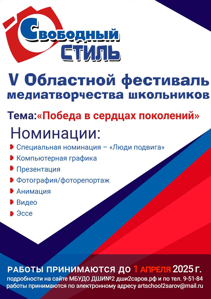Дорогие друзья! Приглашаем Вас принять участие в V Областном фестивале медиатворчества школьников «Свободный стиль»! Мы предусмотрели возможность подачи заявок с помощью Яндекс формы (предусмотрена возможность прикрепить Согласие) или заполнить заявку и выслать на почту с пометкой «Свободный стиль» на электронную почту artschool2sarov@mail.ru (подробнее в Положении).